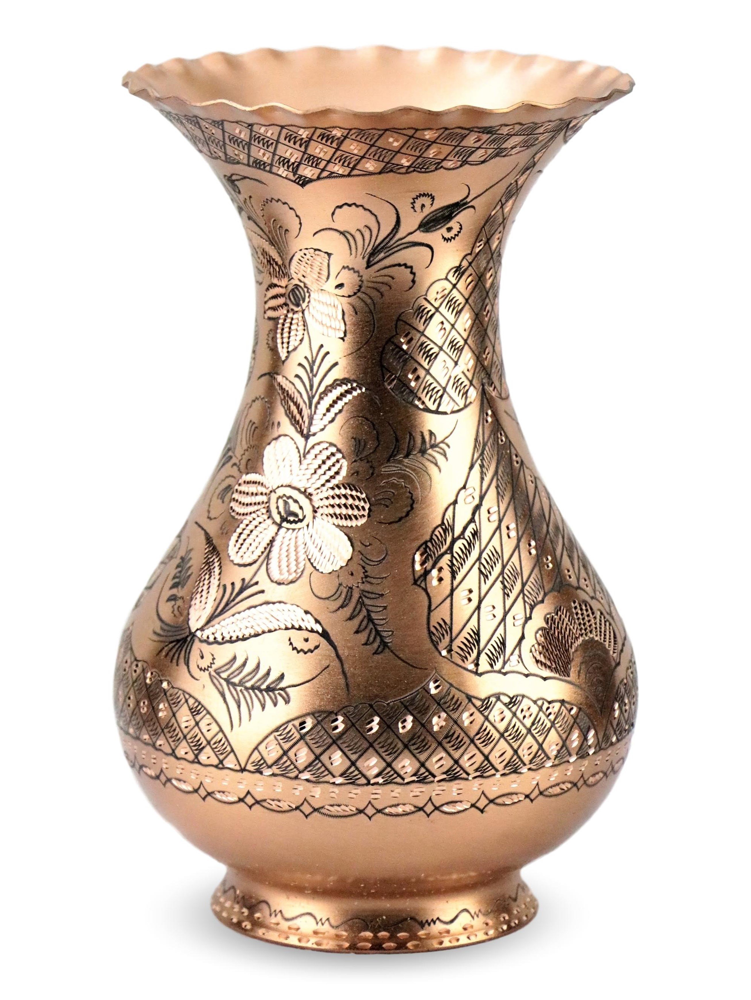 Gül Çiçek Eskitme İşlemeli Bakır Vazo (560)