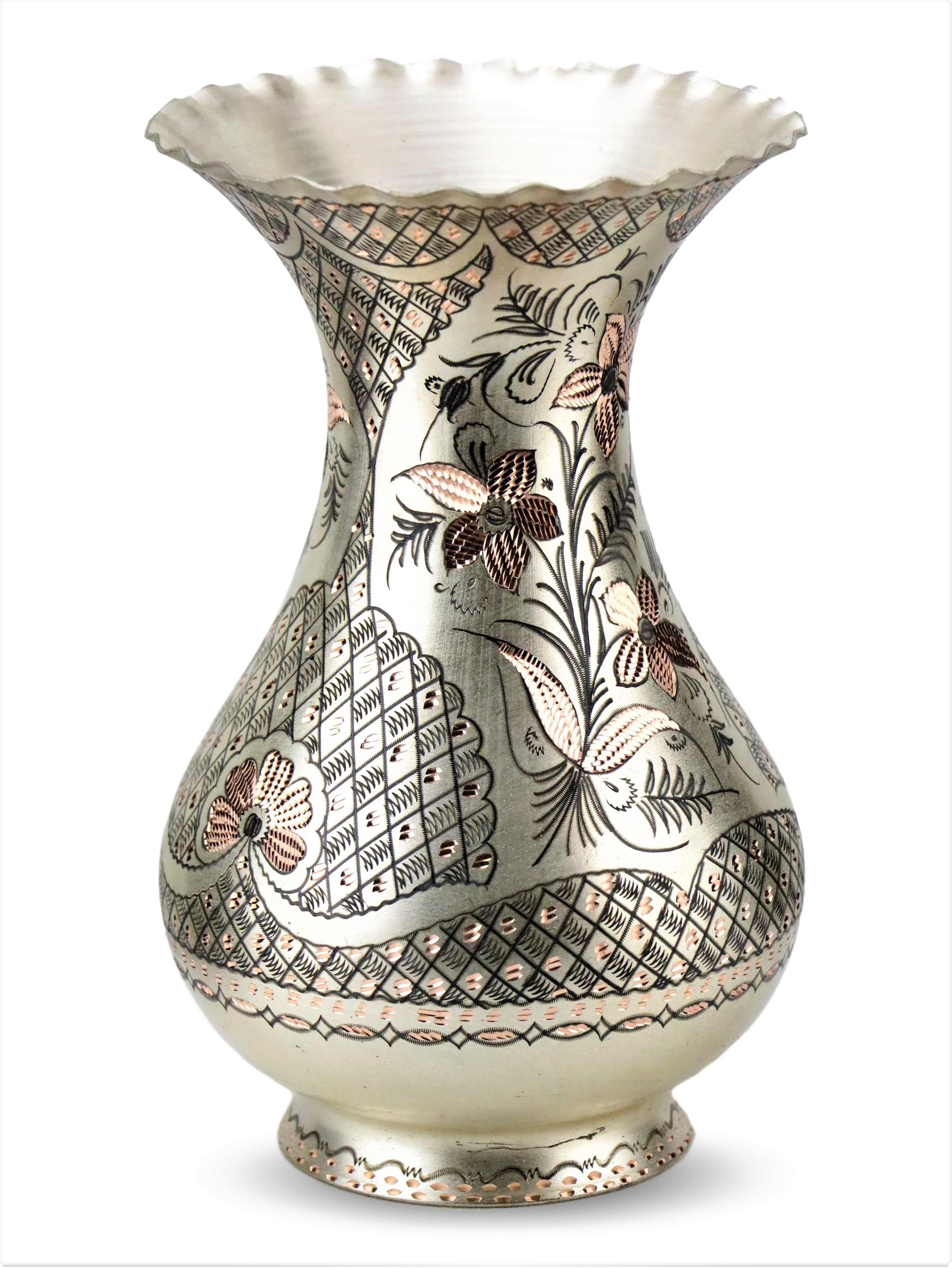 Gül Çiçek Gümüşlü İşlemeli Bakır Vazo